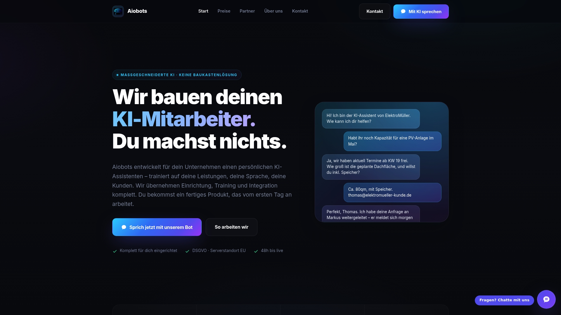 Aiobots unterstützt Sie dabei, genau diesen Schritt zu gehen. Unsere KI-Chatbots beantworten häufige Fragen automatisch, qualifizieren Interessenten vor und sorgen dafür, dass keine Anfrage verloren geht. Auf der Aiobots Homepage erfahren Sie mehr über unsere Lösungen für Dienstleister und KMU. Wenn Sie direkt wissen möchten, was für Ihre Website möglich ist, können Sie jetzt unkompliziert Kontakt aufnehmen und eine individuelle Beratung anfragen.